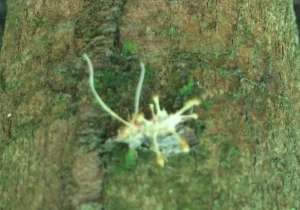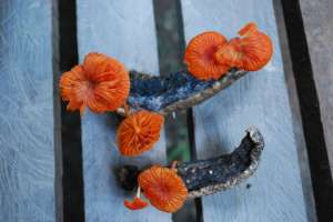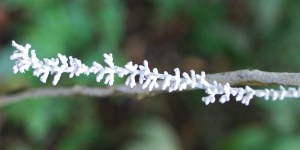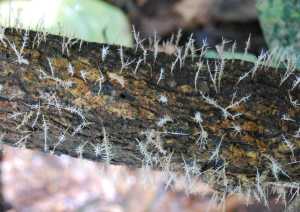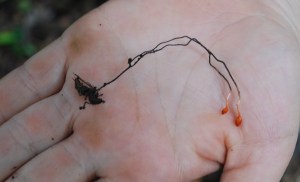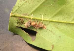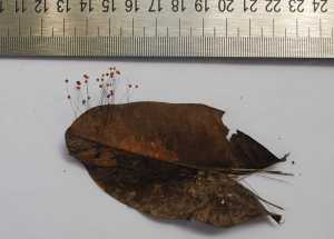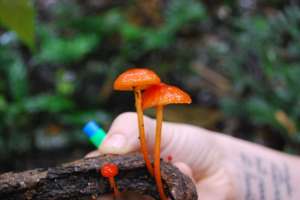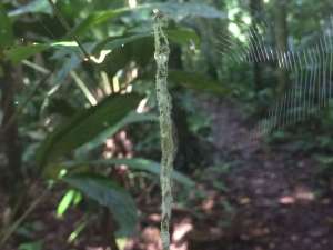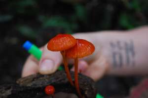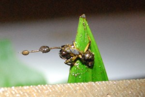 One can find anything from grasshoppers laying in the leaf litter sprouting finger-like orange mushrooms, to wasps and ants, mandibles clamped in death to leaves and displaying fine silver filaments, to termites buried in mounds with six centimeter stipes protruding and topped with two-millimeter bright red fruiting bodies.