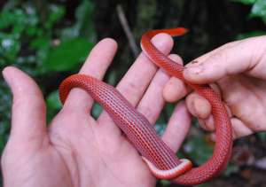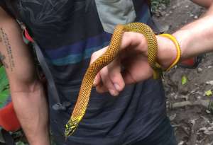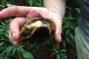 Five minutes walk on the path to the station from our boat docked on the Rio Las Piedras, herpetologist, Pat Champagne picked up the golden snake shown below. Red snakes (oxyrhopus I believe) were quite calm in Melanie Deschs’ hands and primatologist, Clemencia spotted this turtle in a puddle on the trail. Note that this was an educational event and the animals were quickly released. (Most will agree that in a natural setting, and especially from the animal’s point of view, the less interaction with humans, the better.)