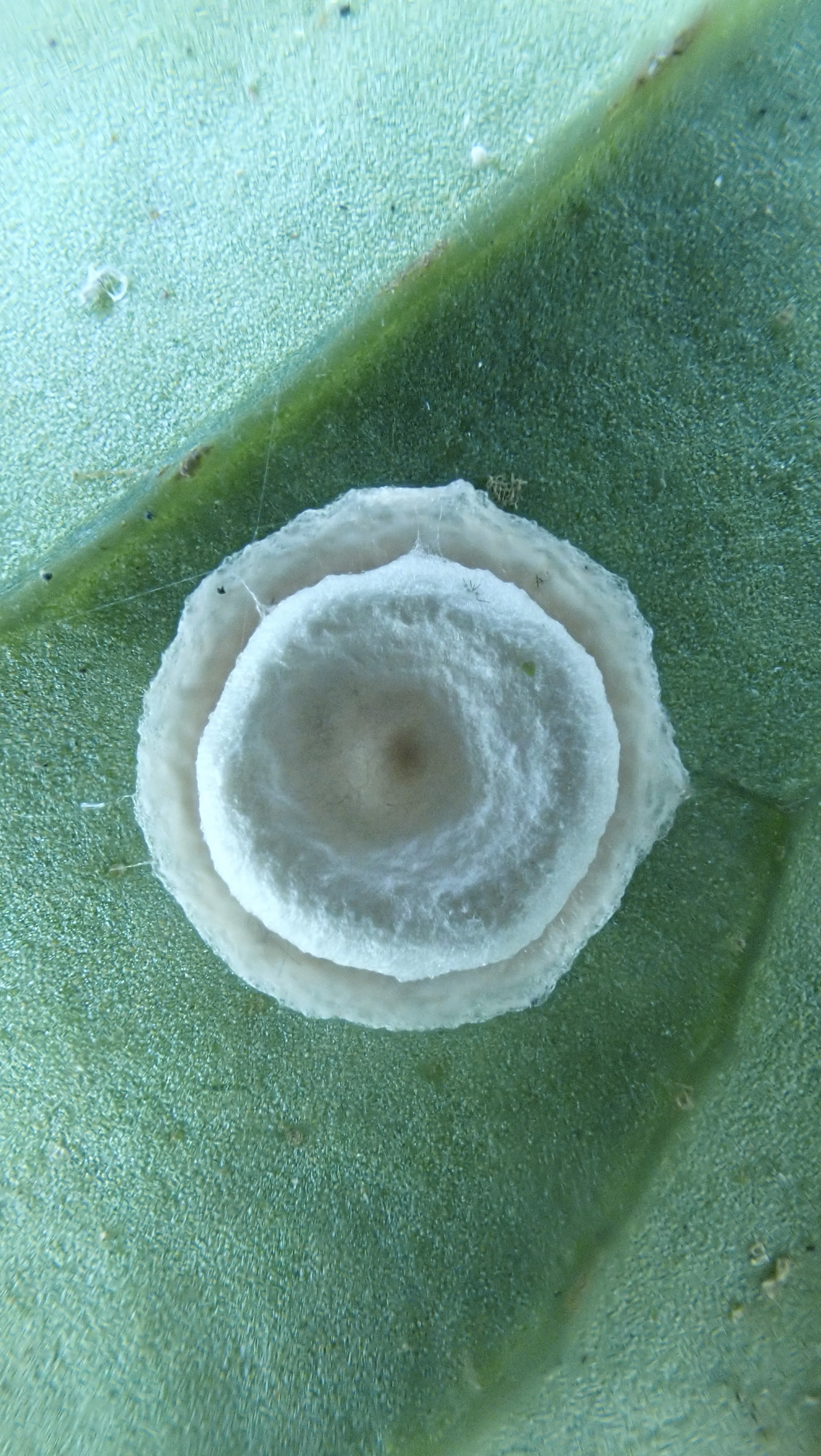 Recolecté un ejemplar intacto y lo mantuve bajo un recipiente de vidrio invertido sobre el fragmento de hoja al que estaba adherido. Durante varios días de observación, presencié la emergencia de una diminuta cría desde el interior del recipiente, un evento que sugiere la función de la estructura como ooteca o cámara de cría. (Posteriormente, se publicarán fotografías o un video de este evento una vez localizado).