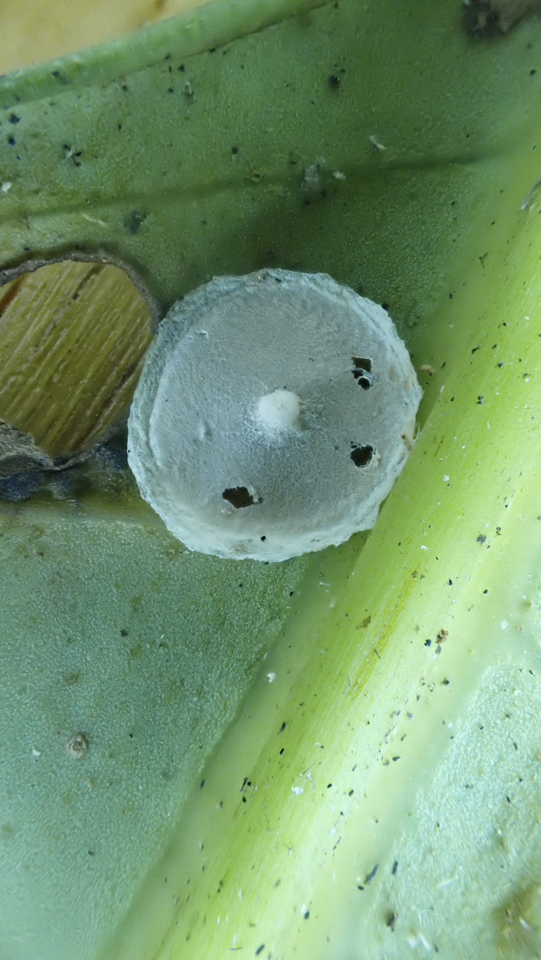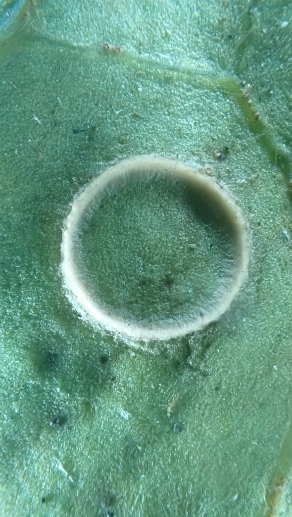 As the structure deteriorates, the dome detaches—apparently shearing away from the central pillar—leaving only the lower portion of the silk saucer adhered to the leaf surface. With further decay, this basal section also sloughs off, ultimately leaving a circular trace or rim. The remaining impression resembles a miniature crater — the final remnant of the silk architecture that once rose above it.