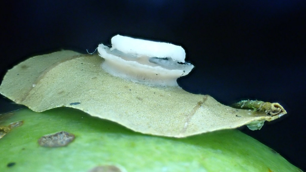 I collected one intact specimen and maintained it under an overturned glass on the leaf fragment to which it was attached. Over several days of observation, I witnessed the emergence of a minute spiderling from within the enclosure—an event suggesting the structure’s function as an egg case or nursery chamber. (Photographs or a video of this event may follow once located.)