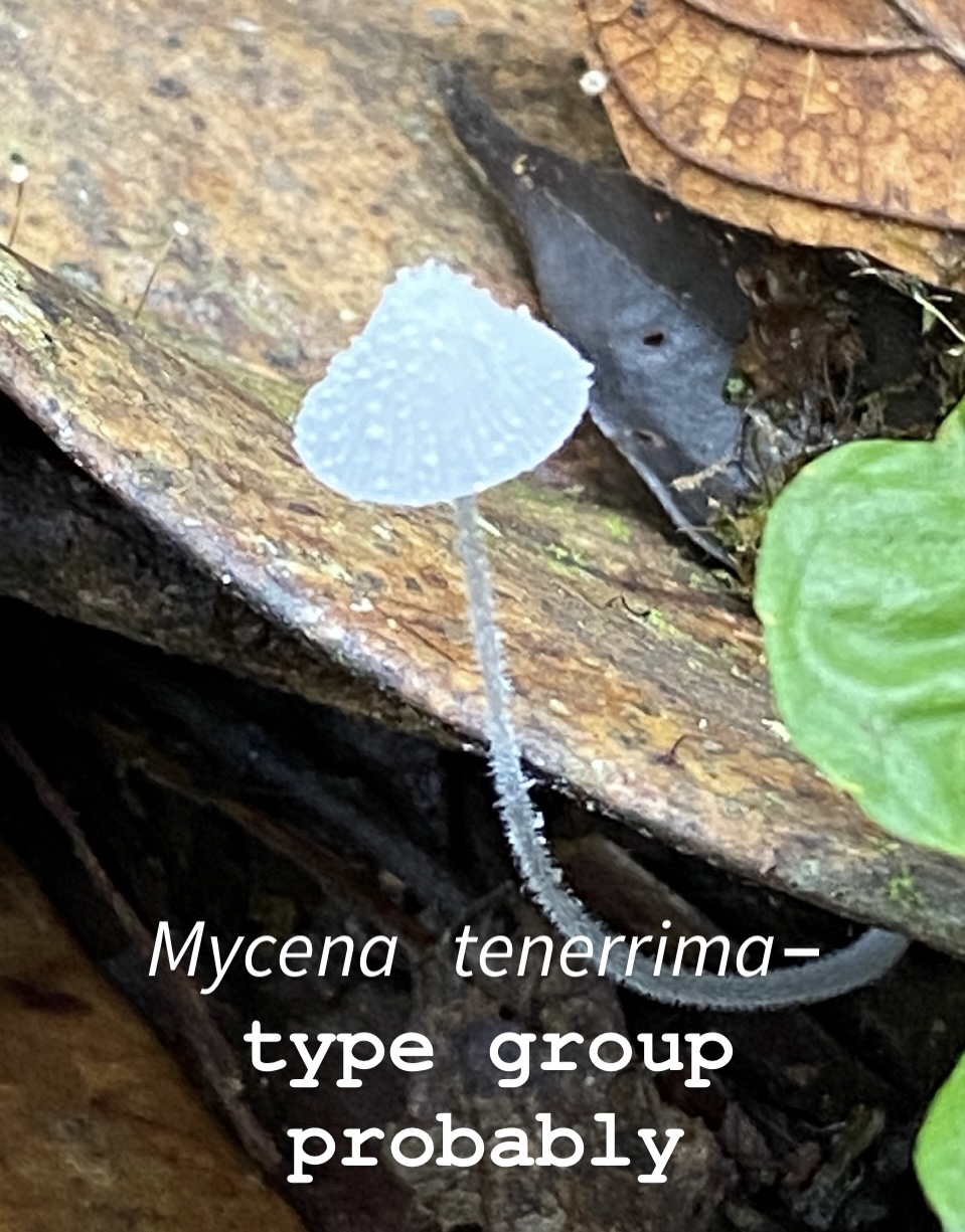 This next tiny mushroom from Soqtapata is best treated as a Mycena species: one of the extremely delicate, long-stemmed micro-fungi of humid Andean cloud forest. Its very small, radially striated cap; glassy, almost “icy” translucent appearance; extremely slender, hair-fine stipe covered in minute hairs; and growth directly from decaying wood and leaf litter all point toward the Mycena tenerrima / “filament Mycena” type group (possibly in the section Fragilipedes). Because many of these tropical micro-Mycenas are poorly studied and likely include undescribed species, we can’t be 100% certain of the exact species, but on structure and habitat, Mycena is by far the most defensible identification.