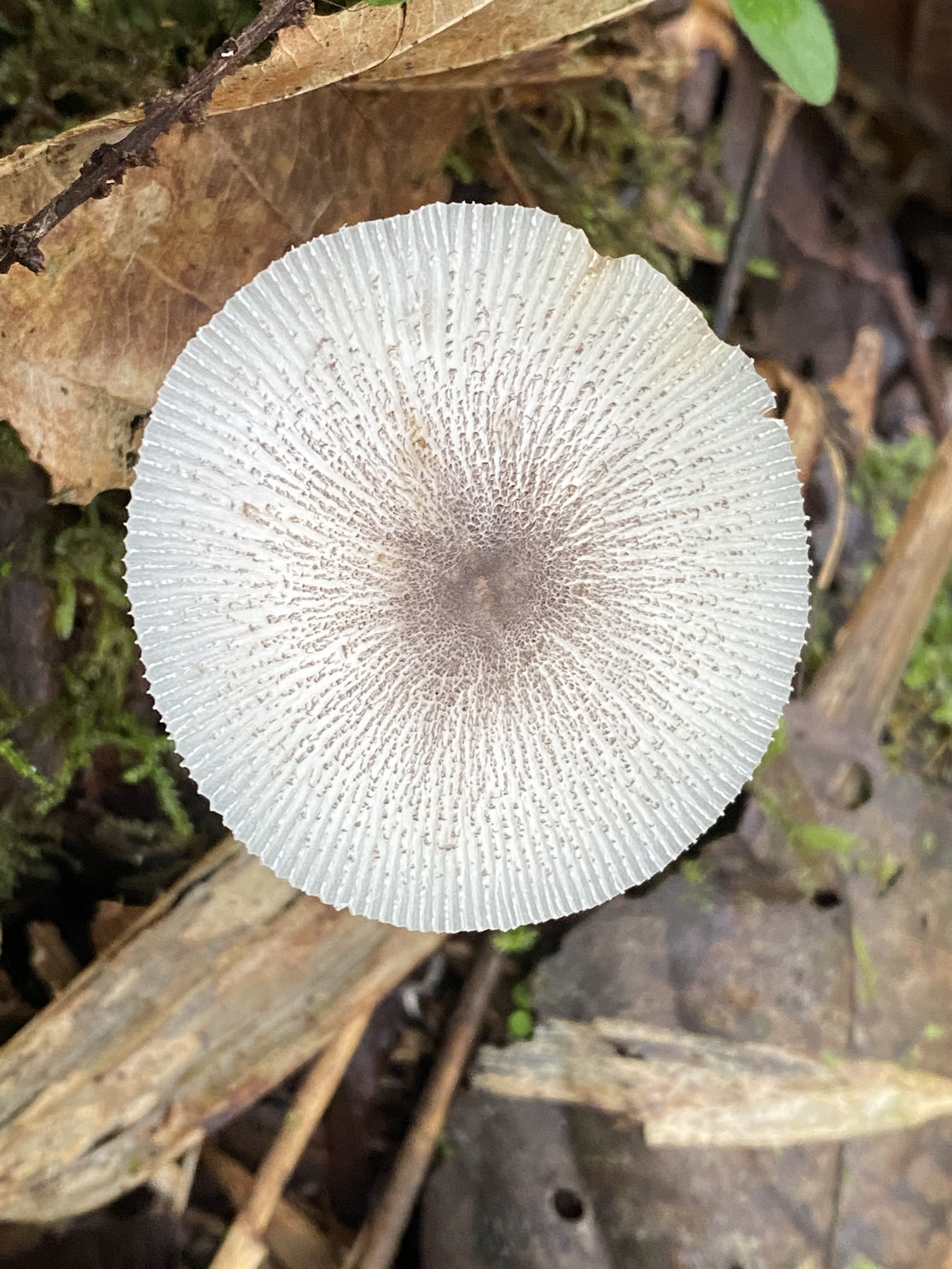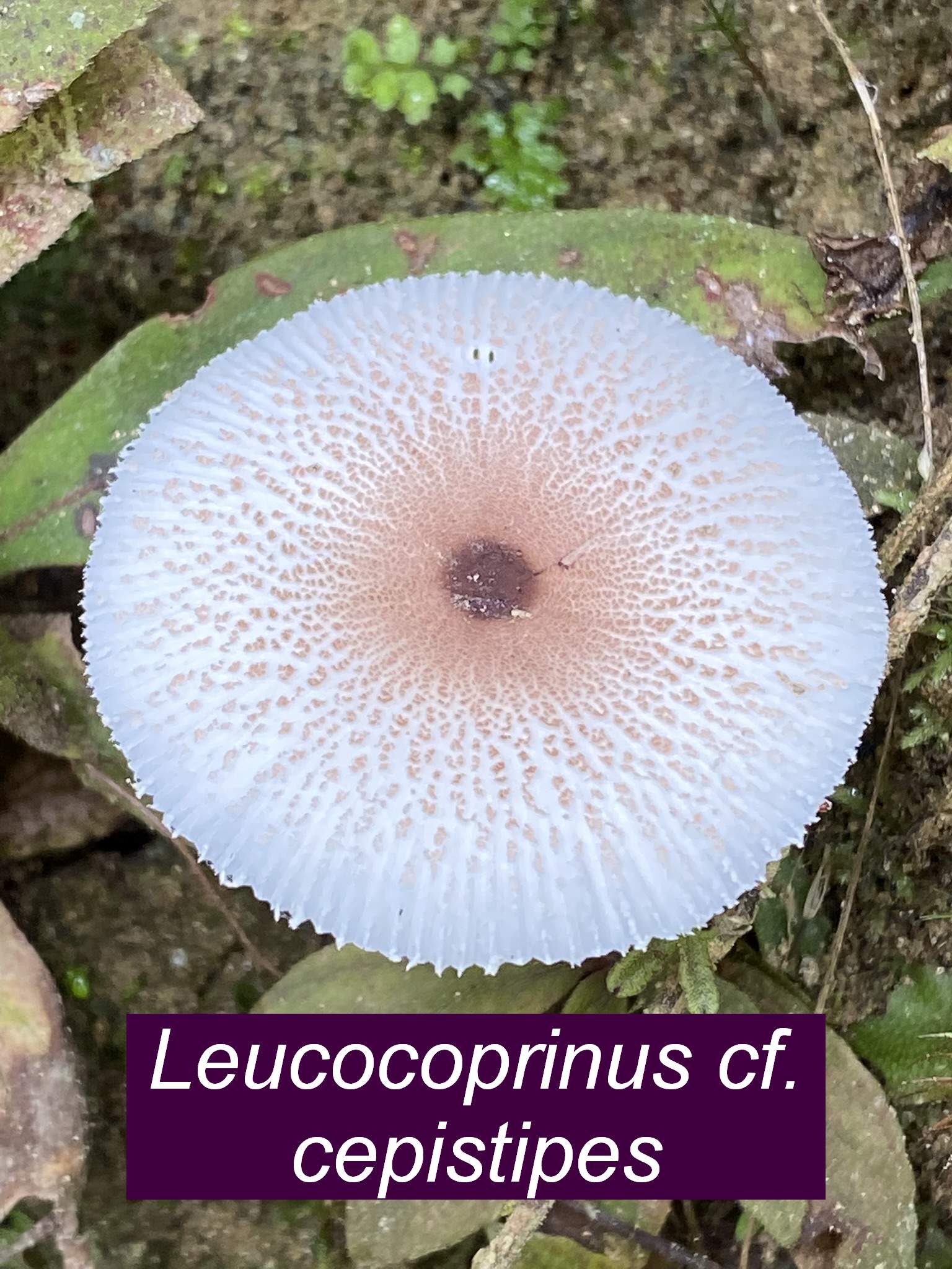 Los ejemplares observados se asemejan más estrechamente a Leucocoprinus cepistipes (conocido comúnmente como “parasol de tallo cebolloso”), un complejo de especies de distribución cosmopolita, caracterizado por su estructura delicada, el margen del sombrero fuertemente estriado, la coloración pálida con un disco central más oscuro y su tendencia a fructificar sobre madera en descomposición u otros restos orgánicos. Esta especie, o taxones estrechamente relacionados, está bien documentada en Centro y Sudamérica y es totalmente compatible con hábitats forestales húmedos de media altitud, como los presentes en Soqtapata.