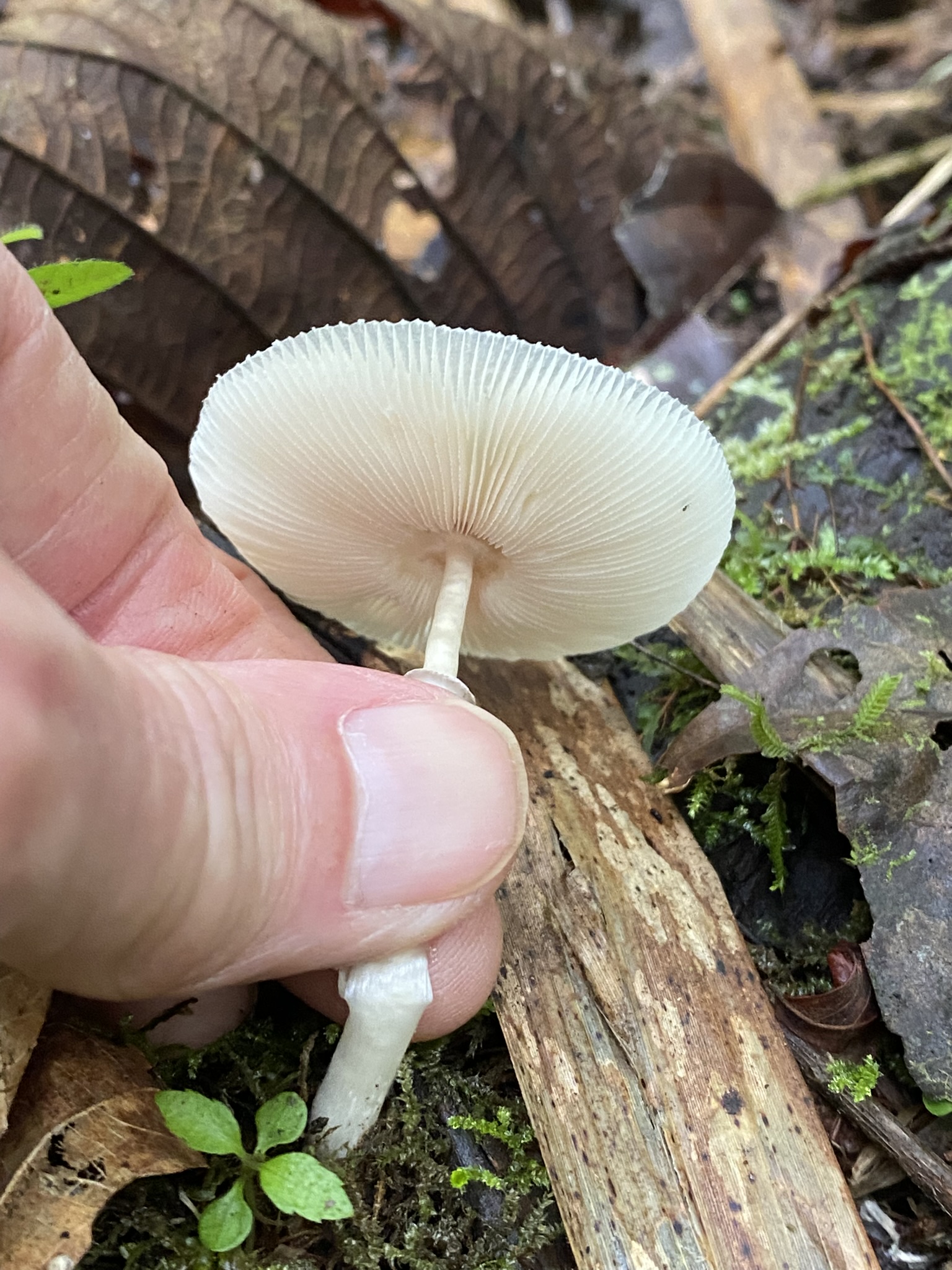 During field observations at Soqtapata, Peru, at approximately 3,000 feet (≈900 m) elevation, I documented several small, delicate agaric mushrooms fruiting from leaf litter and decaying wood in a humid forest environment. Multiple specimens were photographed, including top-down views of the cap and an underside view showing the gills and stipe.