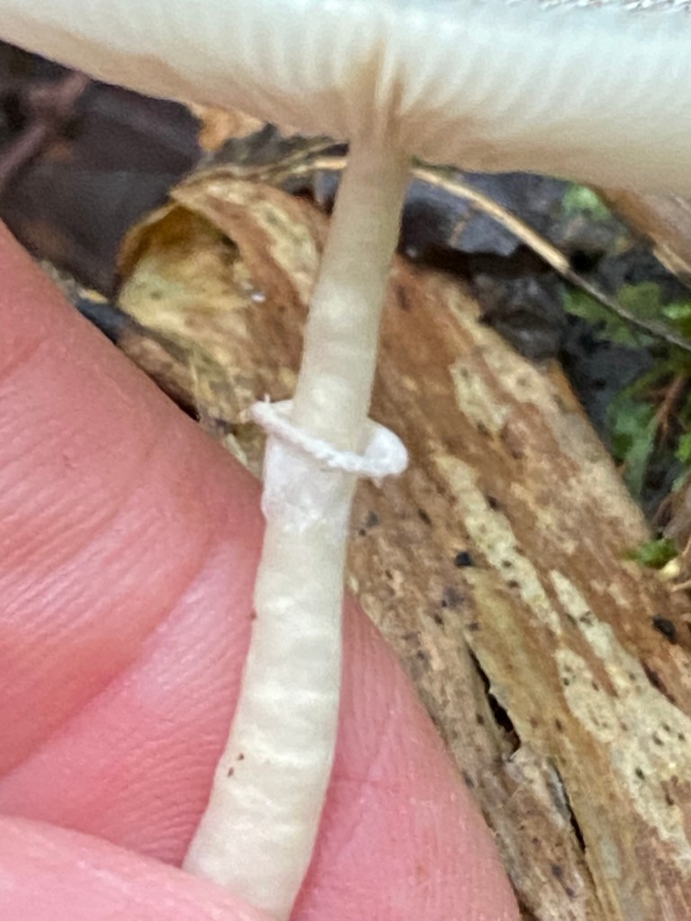 - A slender white stipe with a fragile, ephemeral ring or ring zone