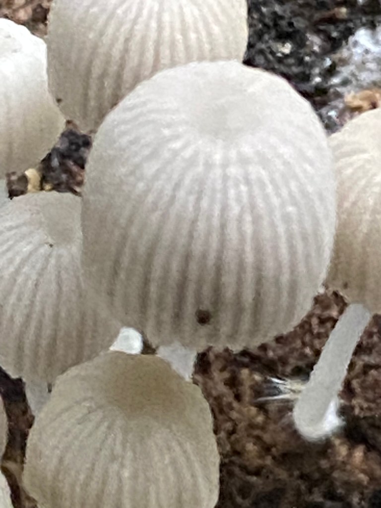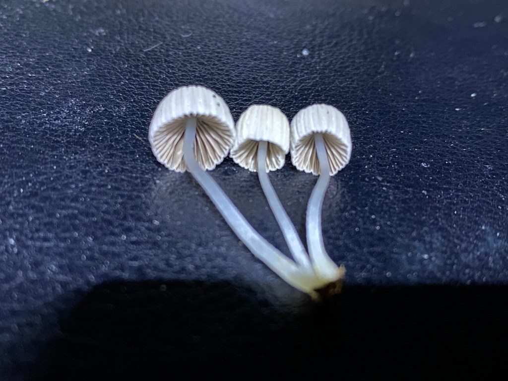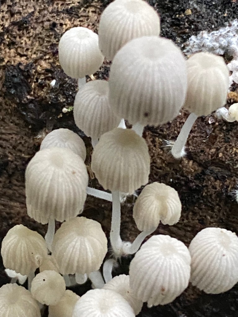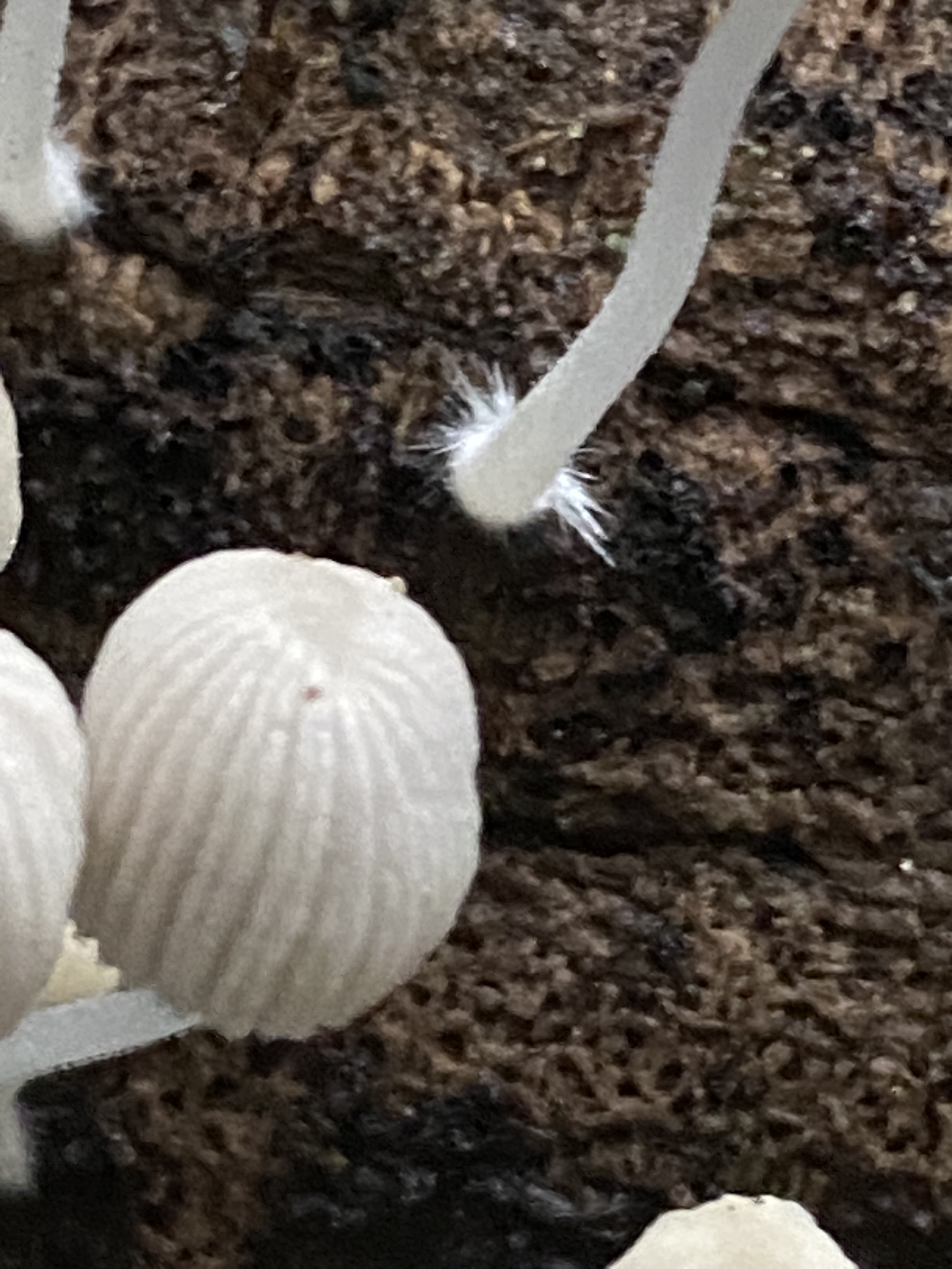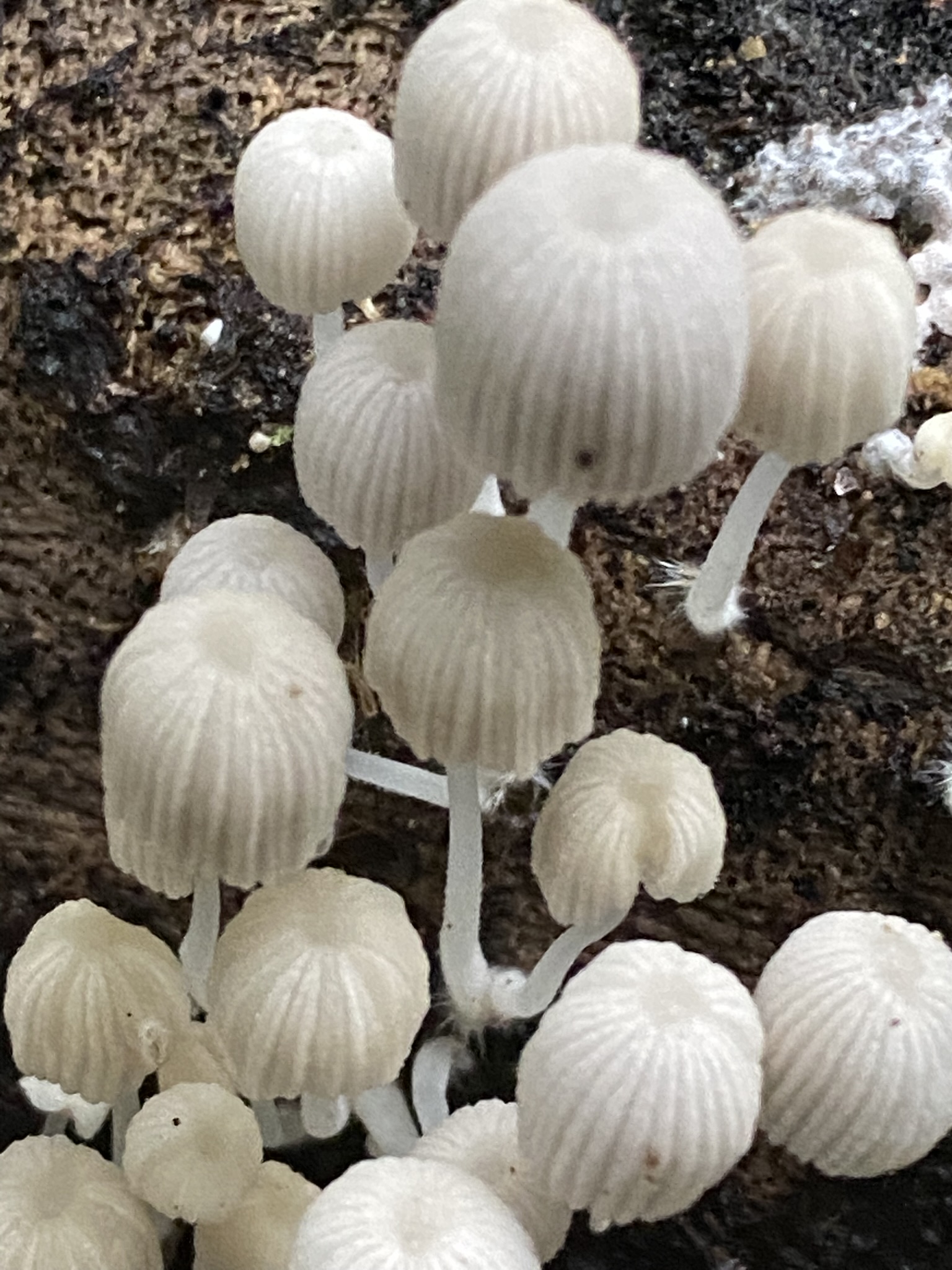 Estos hongos son efímeros y de vida muy corta, apareciendo brevemente tras periodos de alta humedad. Aunque la identificación a nivel de especie es incierta sin análisis microscópico, la combinación de sombreros plegados, tallos translúcidos, micelio basal piloso, crecimiento en grupo y hábitat lignícola concuerda firmemente con el género Mycena, sección Sacchariferae, siendo Mycena adscendens o un pariente tropical cercano la opción más probable.