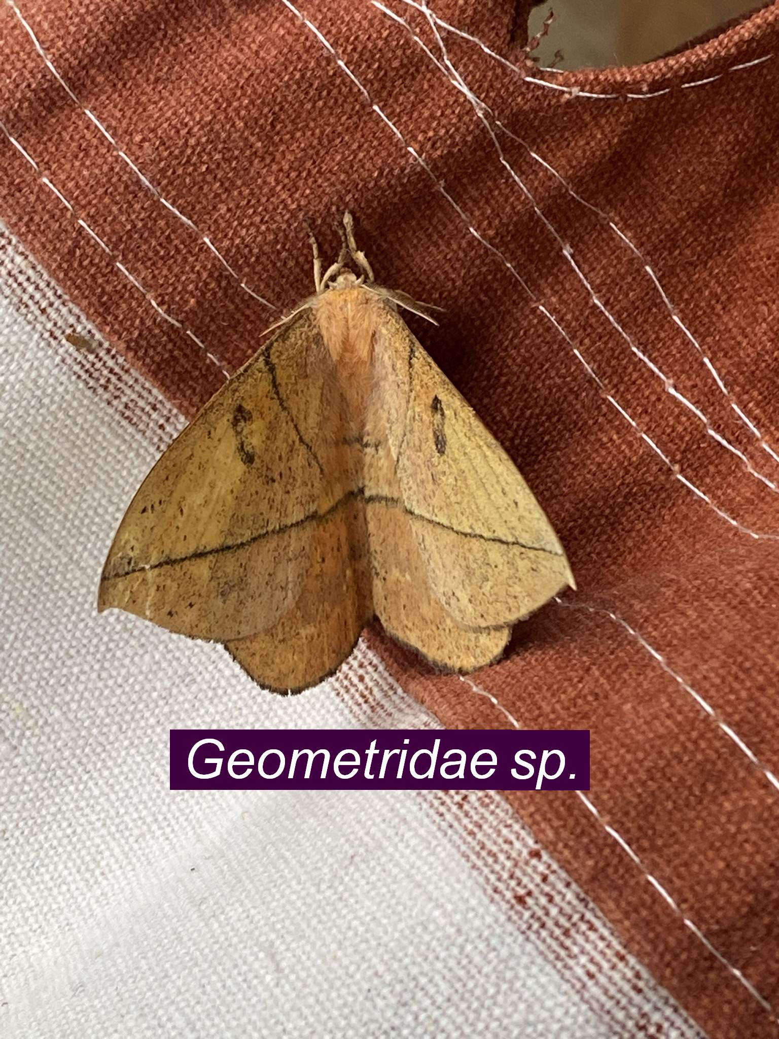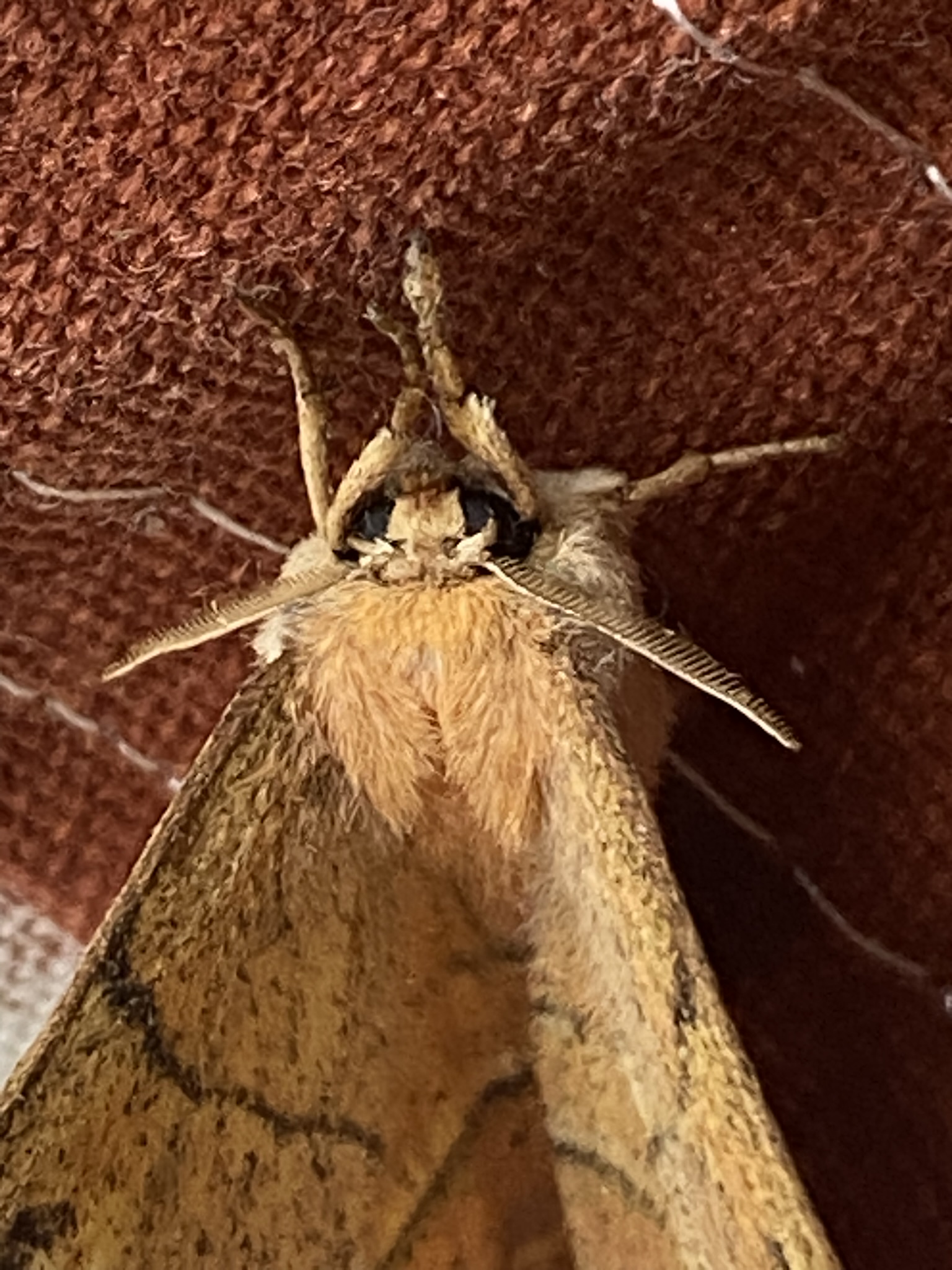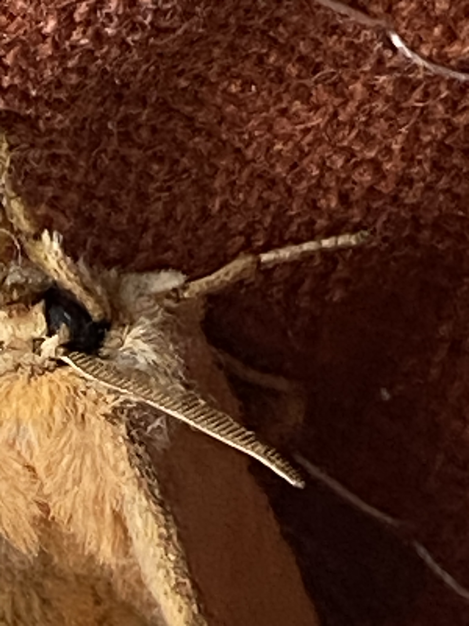 Una polilla de tonos suaves descansa en una postura triangular clásica, con alas recorridas por finas líneas onduladas que difuminan su contorno frente a las texturas del entorno. Sus colores discretos y el patrón delicado sugieren una estrategia de camuflaje más que de advertencia, permitiéndole confundirse con corteza y hojas. Las antenas plumosas indican que se trata de un macho, adaptado para detectar feromonas en el aire nocturno. Estas características son propias de las polillas geométridas (familia Geometridae), un grupo diverso conocido por su belleza sutil y su notable capacidad de ocultamiento.