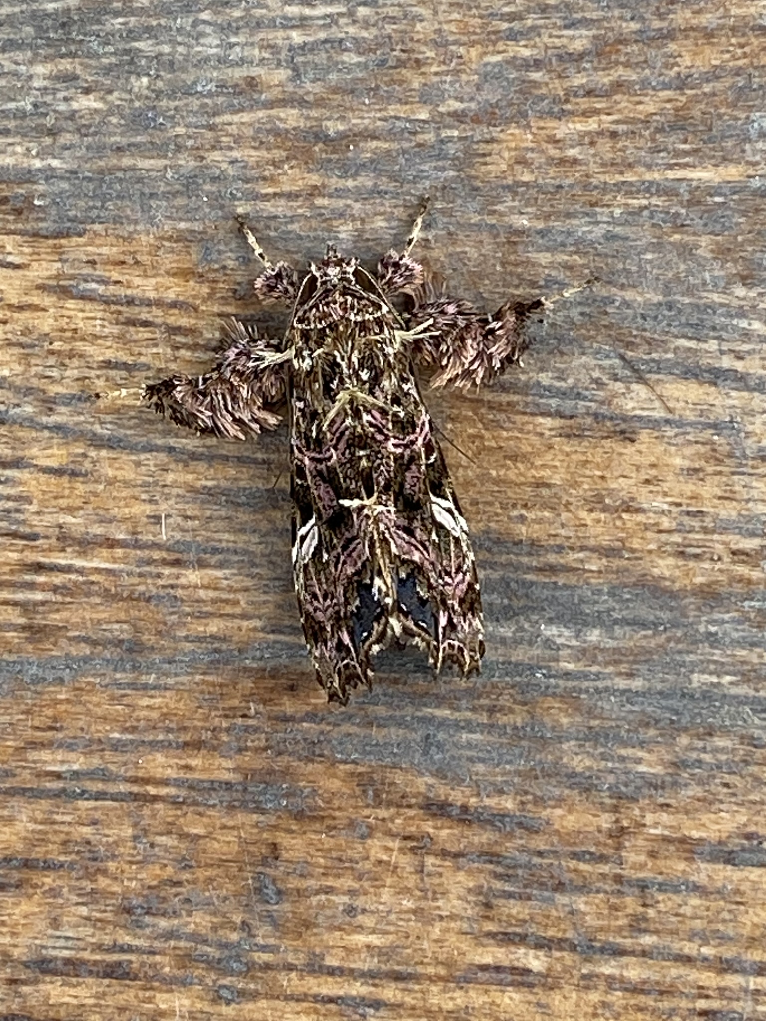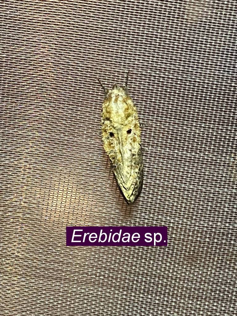 A slender owlet moth (Erebidae) rests in a narrow, tapered posture, its muted tan and olive pattern blending closely with bark and lichen. At first glance it may seem unrelated to the broader, delta-winged owlet moth seen just prior, yet both belong to the same remarkably diverse family. Within Erebidae, form varies widely—from broad, triangular wings to tightly wrapped, cigar-like silhouettes—each adapted to a different strategy of concealment. In this case, the elongated shape and fine mottling minimize the moth’s outline, allowing it to resemble a seed pod or fragment of debris. Like many nocturnal species drawn to artificial light, this individual was found resting on a screen and gently relocated outdoors.