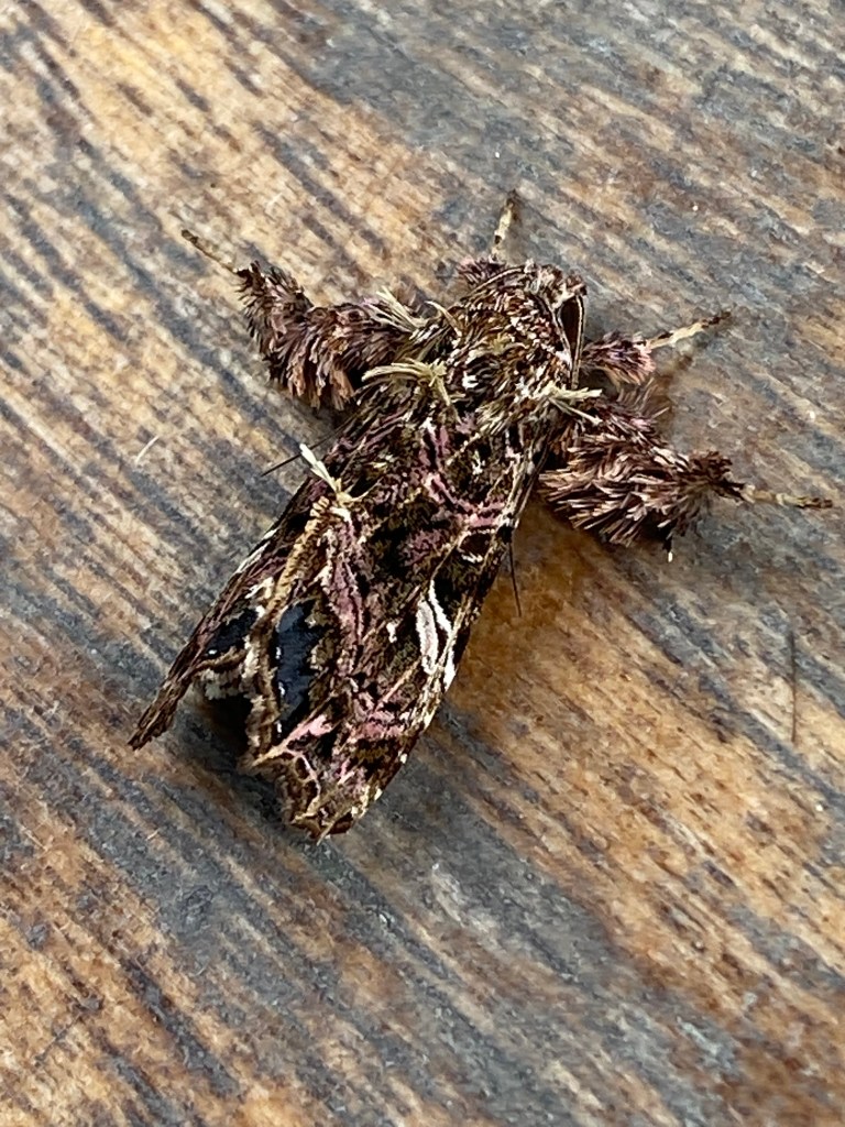 A heavily textured moth rests with its body and wings appearing almost overgrown with fibers, spines, and irregular projections, giving it the uncanny look of debris or decaying plant matter. The mottled browns, creams, and darker patches further disrupt its outline, reinforcing a strategy of extreme camouflage. Rather than merely blending into its surroundings, it seems to mimic them outright, becoming nearly indistinguishable from bark or forest detritus. These features are characteristic of slug moths (family Limacodidae), a group known for both their unusual adult forms and their often equally distinctive larvae.