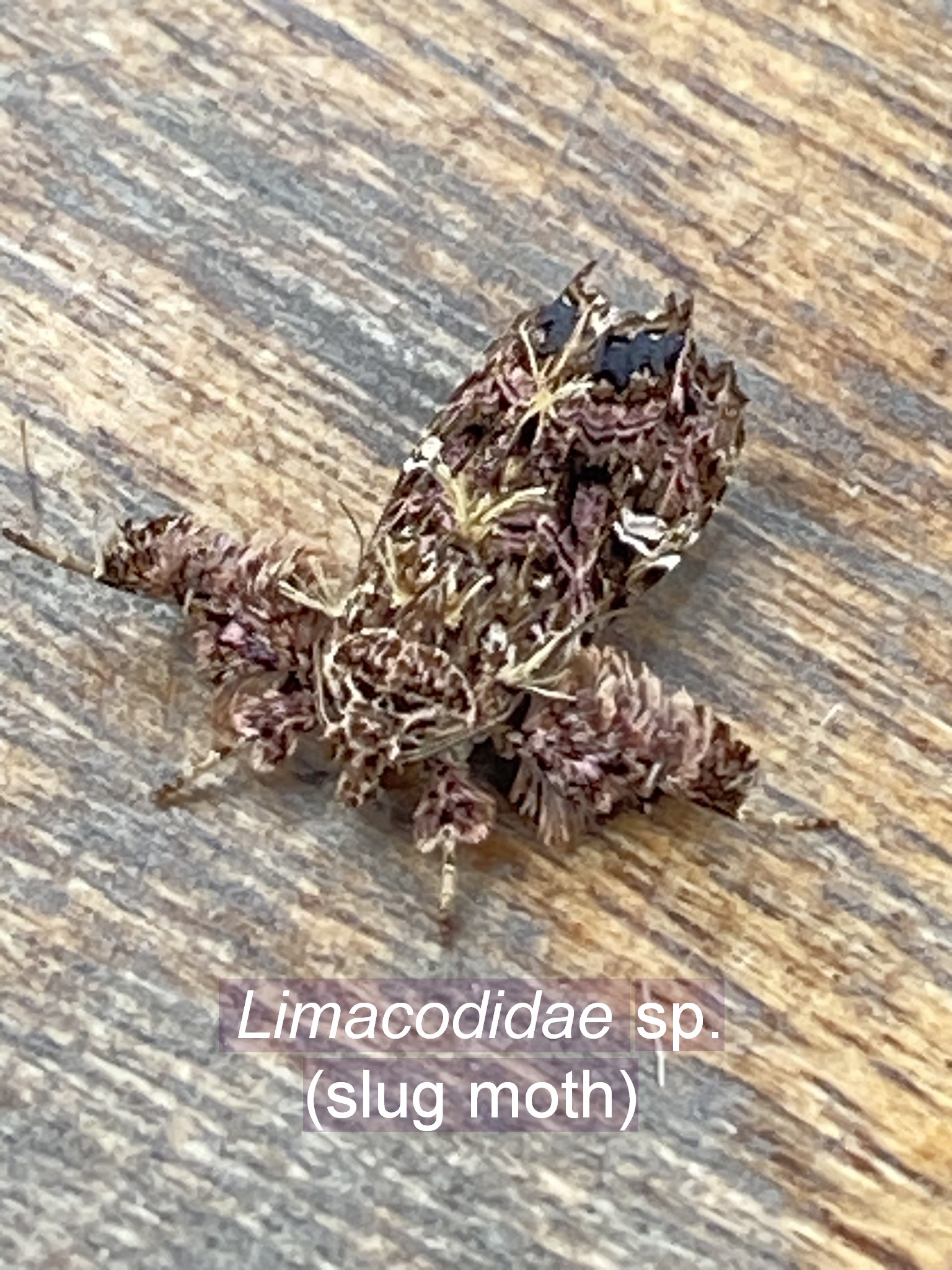 Una polilla de textura densa reposa con el cuerpo y las alas cubiertos de fibras, espinas y proyecciones irregulares, adoptando el aspecto sorprendente de restos vegetales o materia en descomposición. Los tonos moteados en marrones, cremas y áreas más oscuras rompen aún más su silueta, reforzando una estrategia de camuflaje extremo. Más que simplemente mezclarse con el entorno, parece imitarlo directamente, volviéndose casi indistinguible de la corteza o del detrito del bosque. Estas características son propias de las polillas de la familia Limacodidae, conocidas tanto por sus formas adultas inusuales como por sus larvas igualmente distintivas.