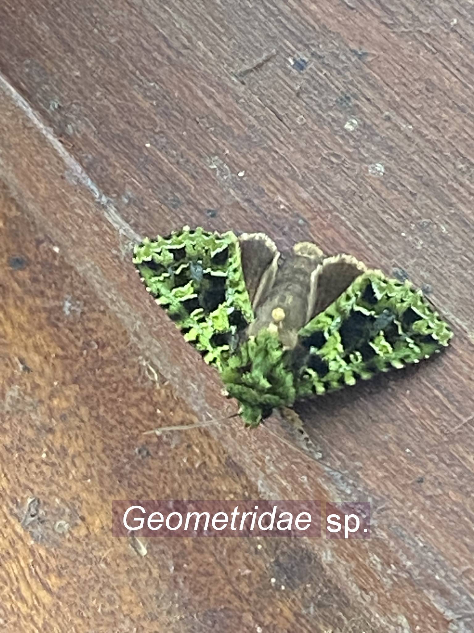 Una polilla de patrón llamativo reposa con las alas extendidas en una postura triangular clásica, con una superficie marcada por intrincados diseños en verde y negro que evocan líquenes o musgos. Aunque no puede ubicarse con certeza entre las llamadas “polillas esmeralda” (un subgrupo de tonos verdes dentro de la familia de las geométridas), su coloración y textura remiten a ese mismo lenguaje visual de crecimiento vegetal. Los bordes irregulares y el patrón moteado rompen su silueta, permitiéndole desaparecer sobre superficies de textura similar. Incluso el denso penacho verde en la región torácica refuerza esta ilusión, dando la impresión de vegetación más que de un insecto en reposo. Esta forma refinada de camuflaje es característica de las polillas geométridas (familia Geometridae), un grupo reconocido por su capacidad de integrarse perfectamente en su entorno.