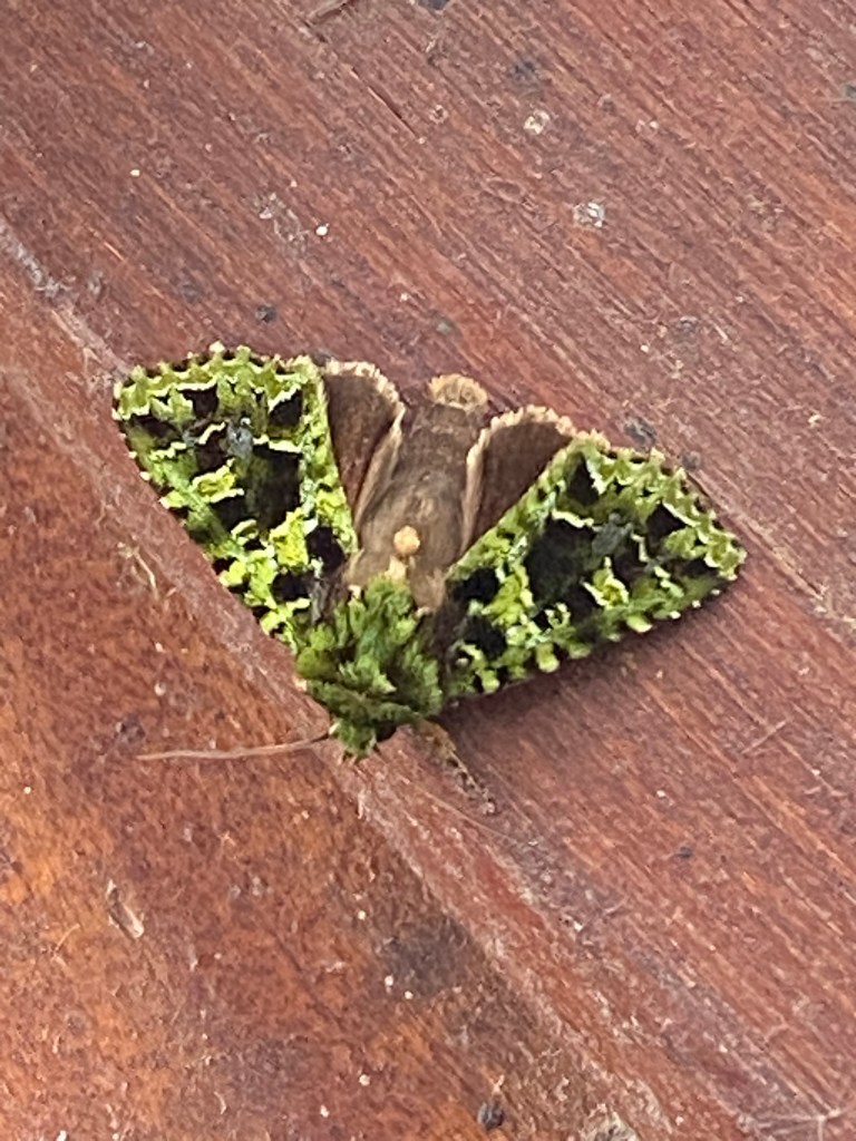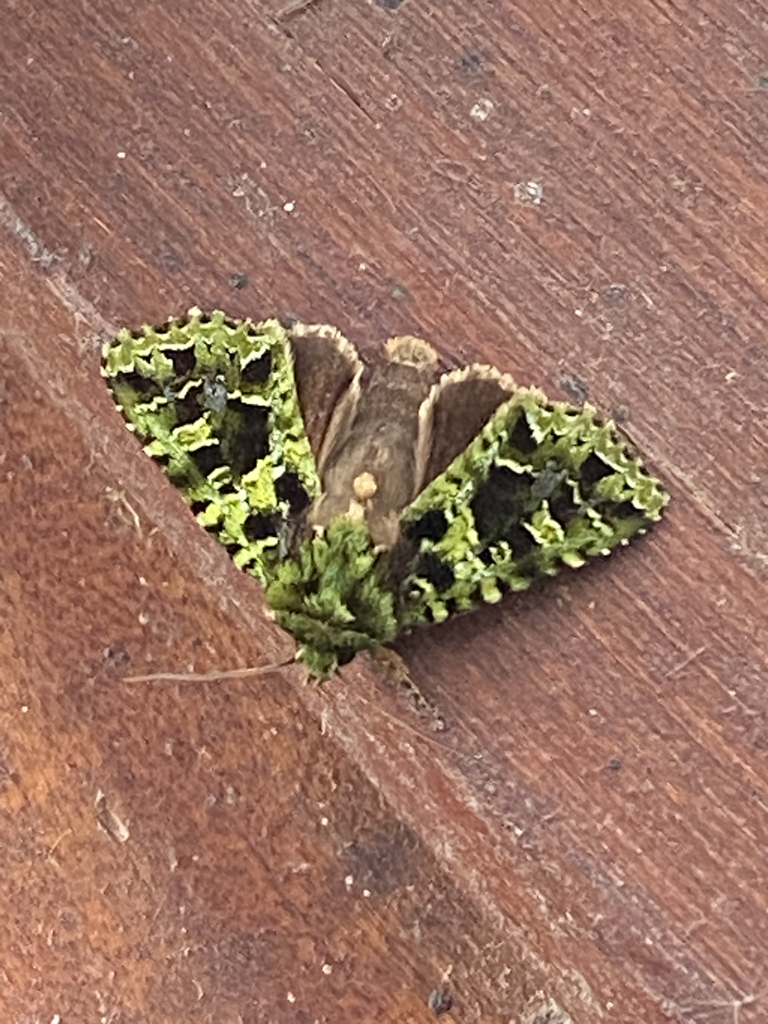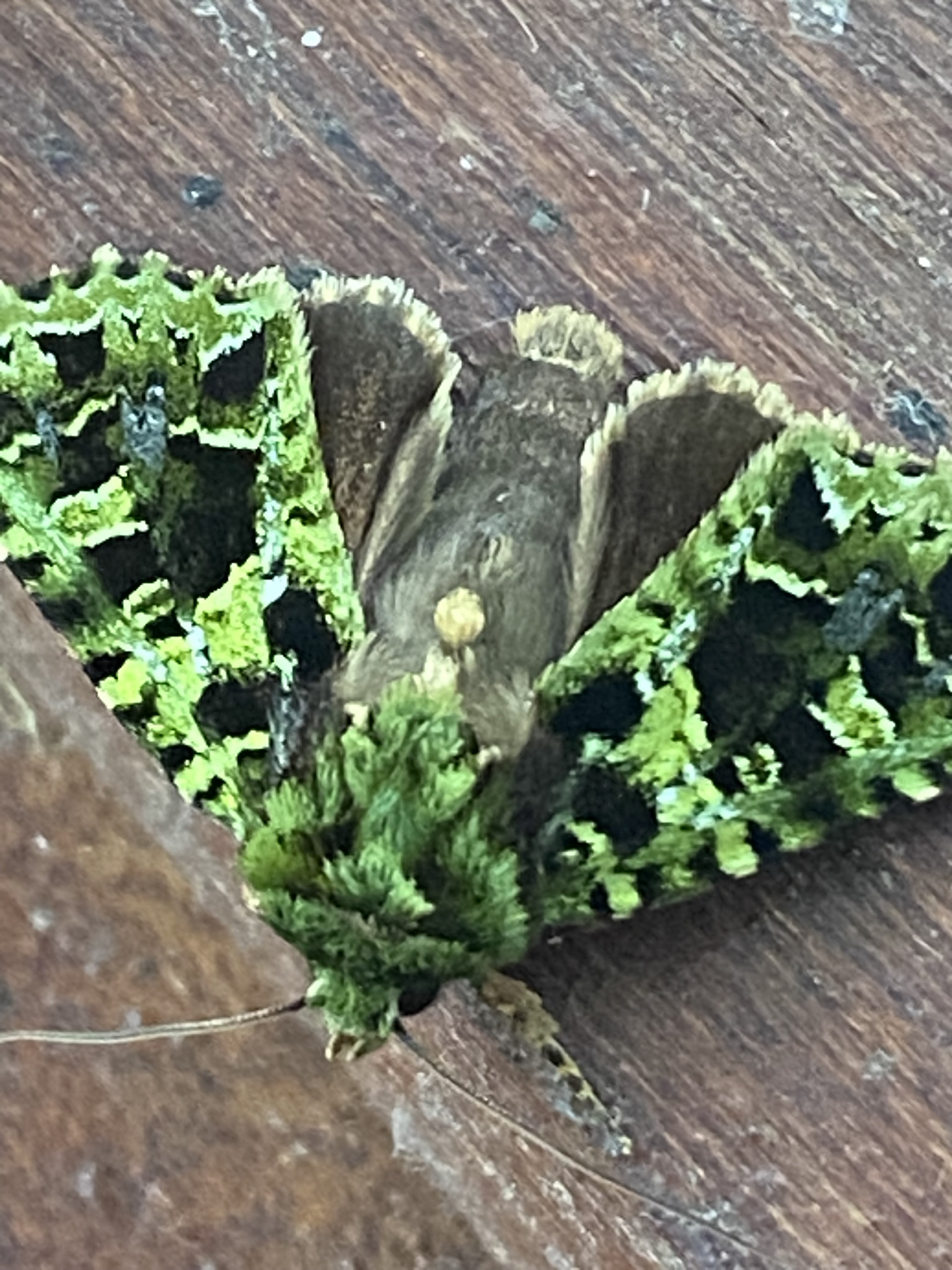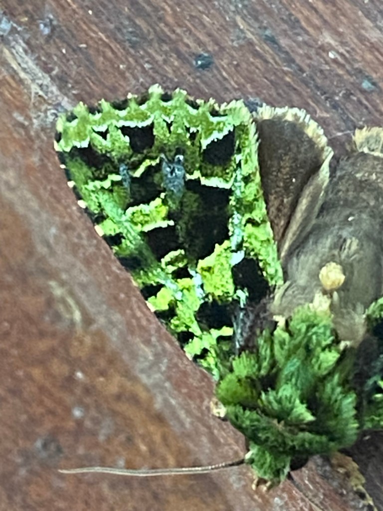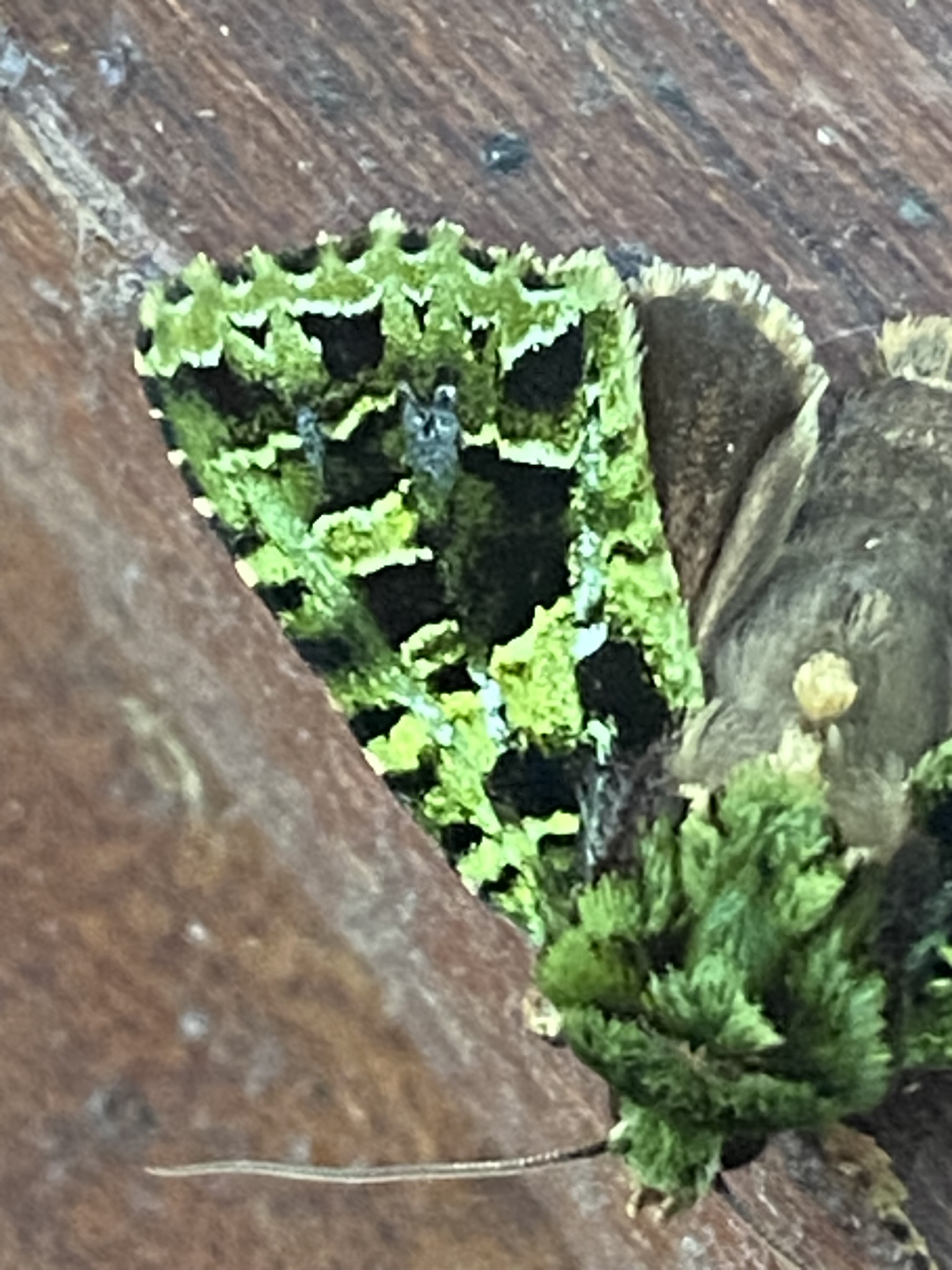 A vividly patterned moth rests with wings spread in a classic triangular posture, its surface marked by intricate green and black patterns that closely resemble lichen or moss. While not definitively placed among the so-called “emerald moths” (a green-toned subgroup within the geometer moth family), its coloration and texture evoke that same visual language of living growth. The irregular edges and mottled patterning disrupt its outline, allowing it to vanish against similarly textured surfaces. Even the dense green tufting near the thorax reinforces this illusion, enhancing the effect of vegetation rather than a resting insect. This refined form of camouflage is characteristic of geometer moths (family Geometridae), a group renowned for their ability to blend seamlessly into their surroundings.