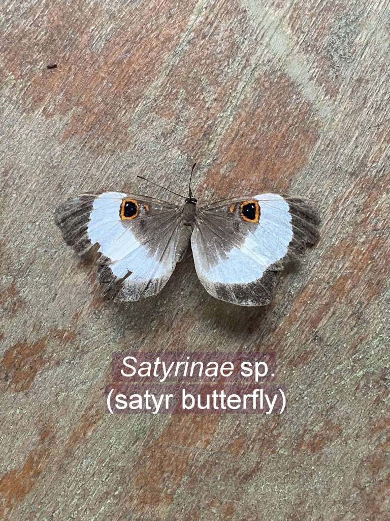 Una mariposa de tonos suaves reposa con las alas abiertas, con marrones discretos y bandas claras que se integran con el suelo del bosque, mientras un par de llamativos ocelos (manchas en forma de ojo)—centros oscuros rodeados por un anillo anaranjado—destacan como rasgos típicos de las satíridas. Las alas redondeadas, con bordes ligeramente ondulados, refuerzan su forma discreta, adaptada al sotobosque sombreado. Estos ocelos probablemente funcionan como señales defensivas, desviando la atención de posibles depredadores hacia zonas menos vulnerables del cuerpo. Esta combinación de camuflaje y distracción visual es característica de las mariposas de la subfamilia Satyrinae, bien adaptadas a ambientes húmedos y de poca luz.