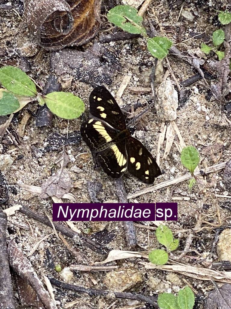 Una mariposa de alas oscuras reposa sobre el suelo del bosque, con un fondo marrón profundo a negro que contrasta marcadamente con bandas y manchas amarillo pálido que destacan entre la hojarasca. Este patrón llamativo fragmenta la silueta de las alas, manteniendo un equilibrio entre el camuflaje y la visibilidad. Con las alas abiertas en una postura típica de asoleamiento, absorbe calor mientras permanece atenta a los movimientos a su alrededor. Esta combinación de forma, comportamiento y patrón es característica de las mariposas de la familia Nymphalidae, un grupo altamente diverso y ampliamente distribuido en los bosques neotropicales.