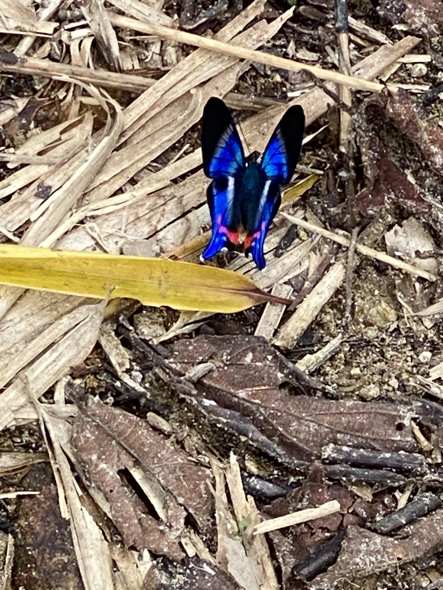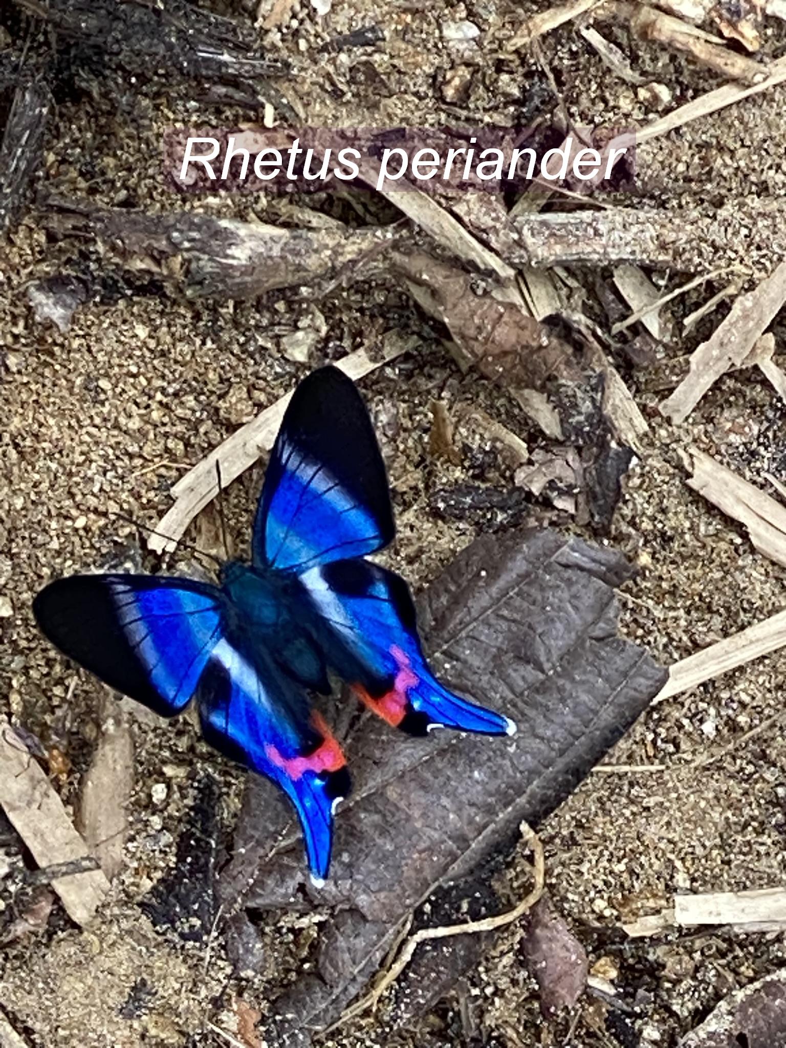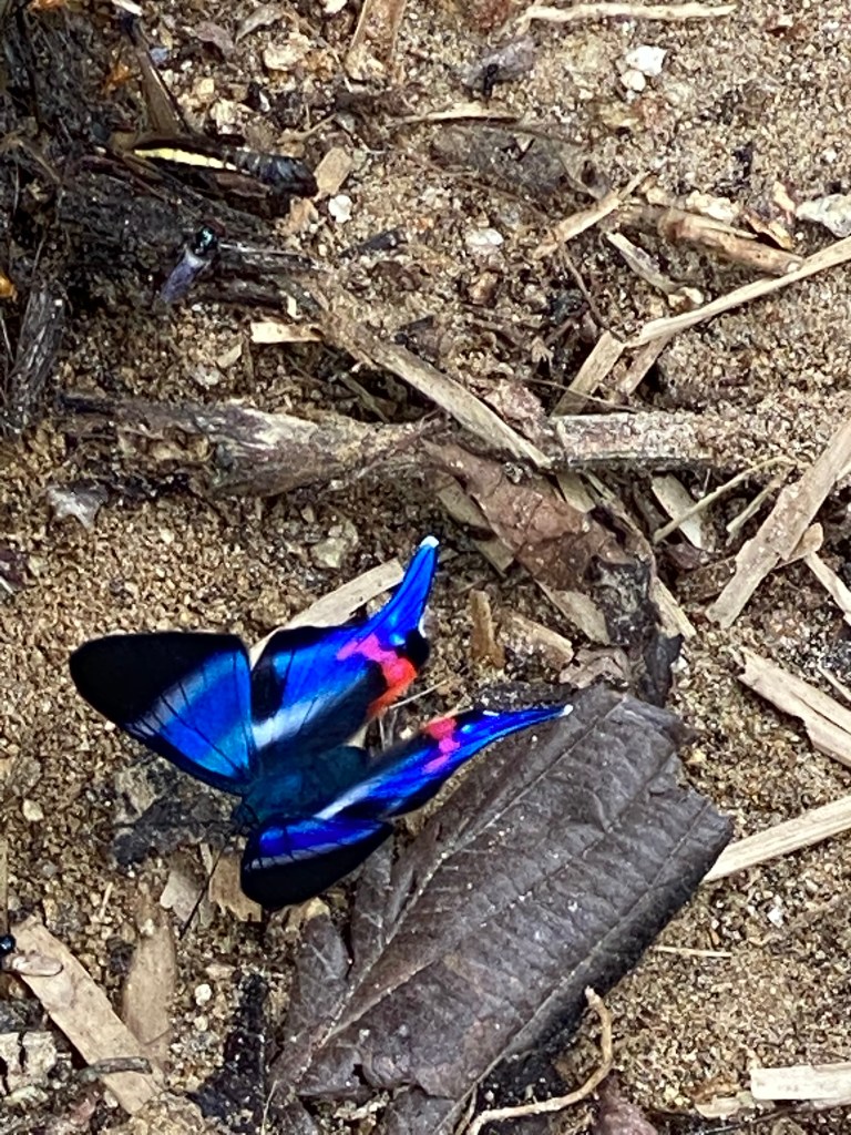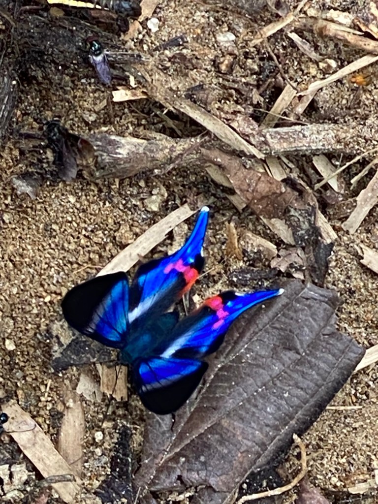 Una mariposa llamativa, Rhetus periander, destella un azul iridiscente mientras descansa brevemente sobre el suelo del bosque, con alas que cambian entre tonos de azul profundo y violeta eléctrico según la luz. Este azul intenso no proviene de pigmentos, sino de estructuras microscópicas en las escamas alares que refractan la luz, un fenómeno conocido como coloración estructural. Las prolongaciones en forma de cola se extienden desde las alas posteriores, mientras que manchas rojas intensas en su base generan un fuerte contraste con los bordes más oscuros. A diferencia de otras mariposas del bosque más discretas que dependen del camuflaje, esta especie apuesta por el impacto visual, y su coloración cambiante probablemente cumple funciones de señalización y reconocimiento entre individuos. El efecto general es dinámico y luminoso, variando con el ángulo y el movimiento en lugar de mantenerse fijo. Esta mariposa pertenece a las llamadas “metalmarks” (familia Riodinidae), un grupo diverso y a menudo finamente ornamentado, bien representado en los bosques neotropicales.