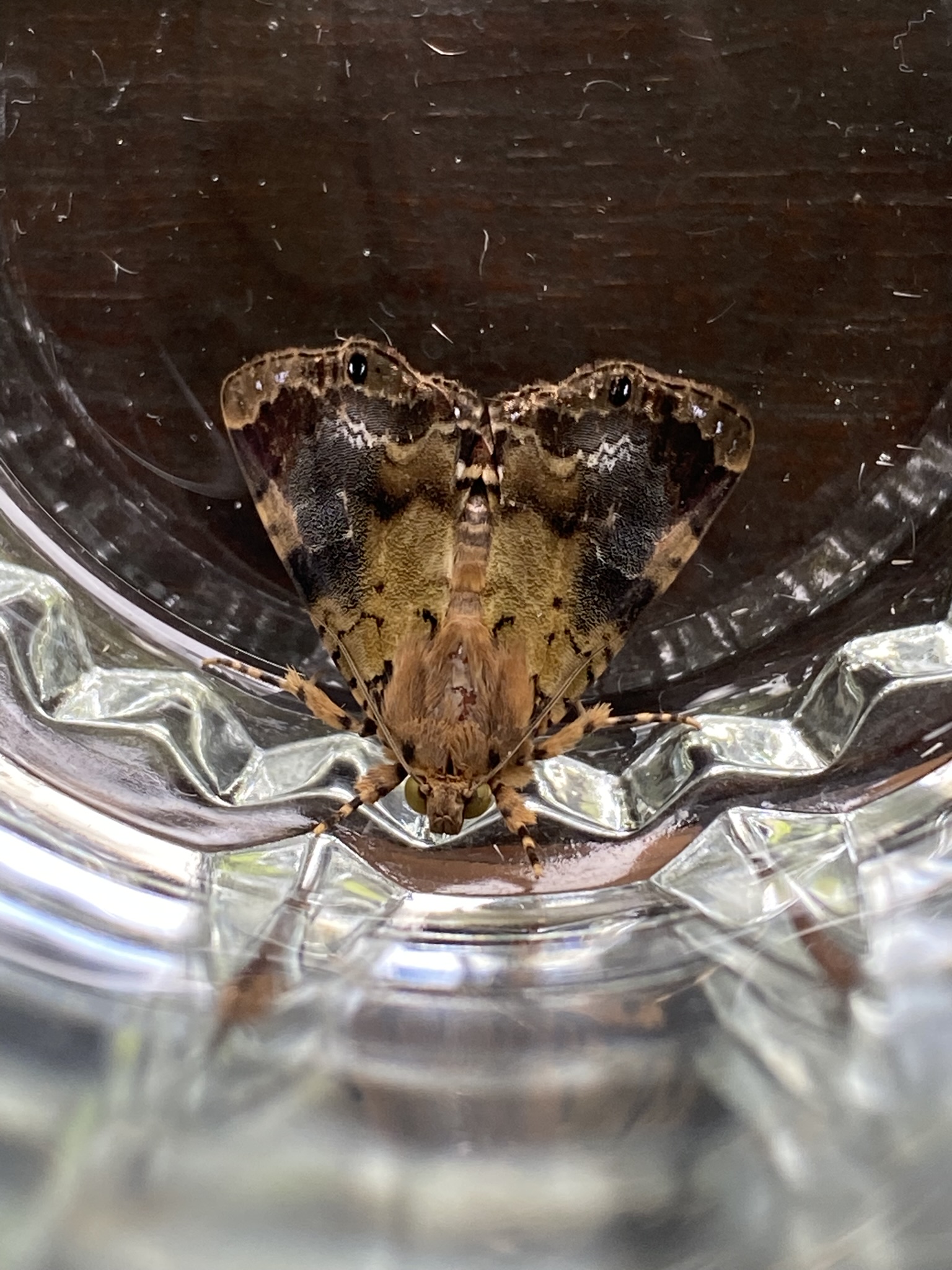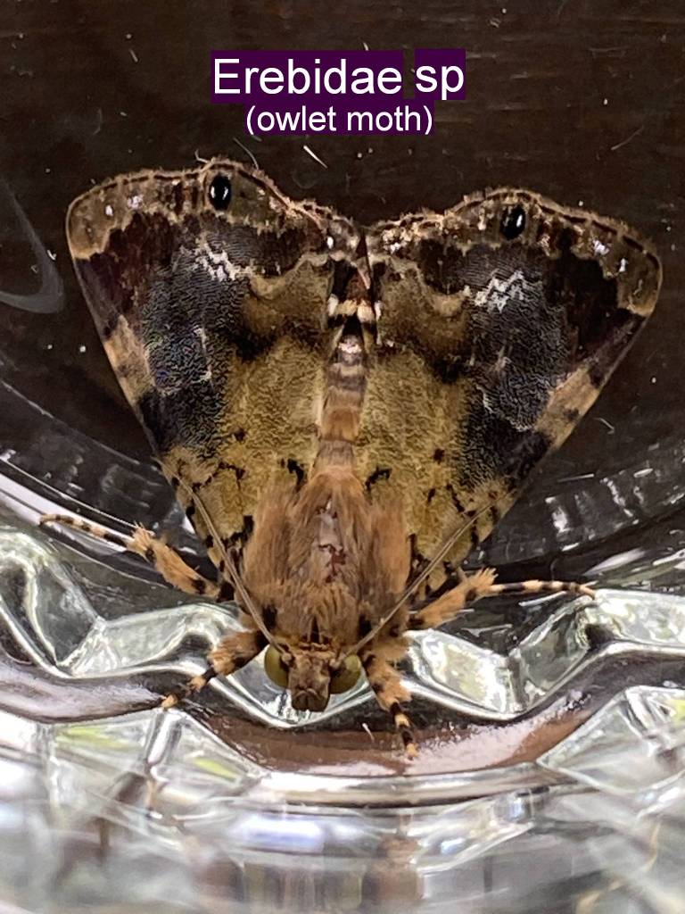A robust owlet moth (Erebidae) rests with wings spread flat, its mottled browns and olives forming effective camouflage against bark and leaf litter. The irregular pattern breaks up the wing outline, while small eyespots near the tips add a subtle defensive element. Unlike the vivid butterflies of the forest, this species relies on concealment rather than display. This individual was found resting on a screen inside the dining hall and was gently relocated outdoors, where it paused briefly before disappearing back into the forest.