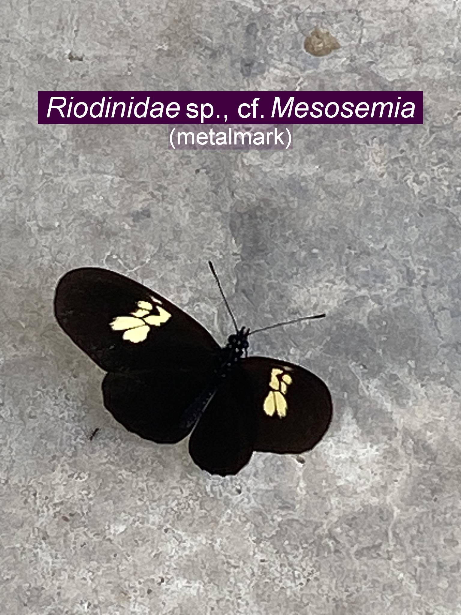 Una mariposa de la familia Riodinidae presenta un patrón sobrio pero llamativo, con alas de tono marrón oscuro a negro interrumpidas por pequeñas manchas amarillo pálido cerca de las puntas de las alas anteriores. A diferencia de especies más vistosas, el contraste aquí es discreto pero intencional, probablemente utilizado para señalización a corta distancia mientras la mariposa permanece relativamente discreta en el entorno del bosque. Los integrantes de esta familia se caracterizan por su diversidad y patrones complejos, que suelen apreciarse mejor al observarlos de cerca.