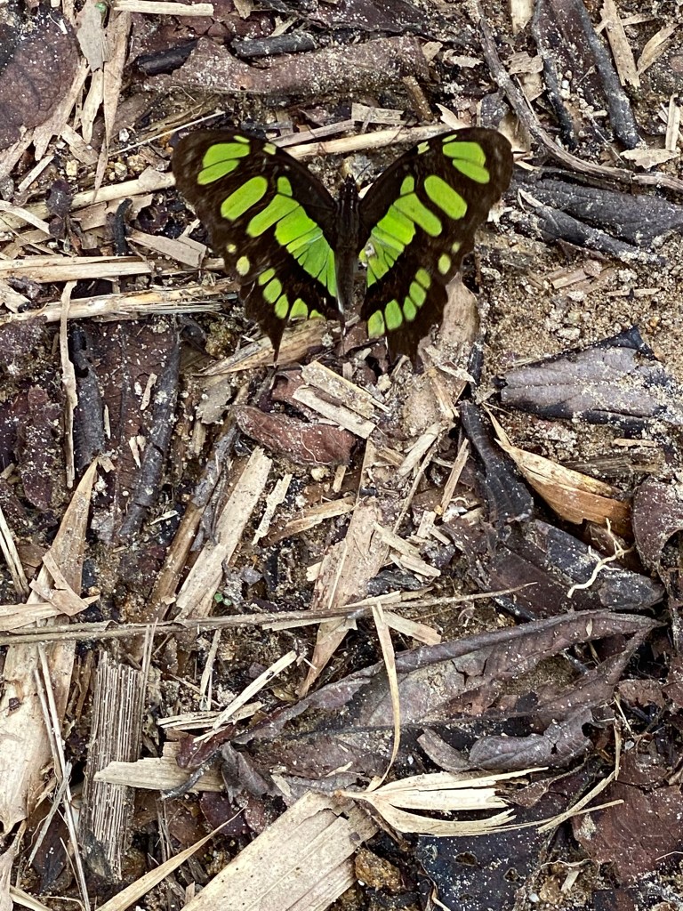 Seen on two separate days in different parts of the forest, these individuals are best understood as the same species, Siproeta stelenes, the Malachite. Its bold, leaf-green markings set against deep brown to black wings form a pattern that feels both organic and deliberate, echoing the shapes and tones of surrounding foliage while still standing out with striking clarity. The wings are broad and slightly scalloped, with a subtle tail on the hindwings, giving the butterfly a fuller, more robust profile than many of its close relatives.