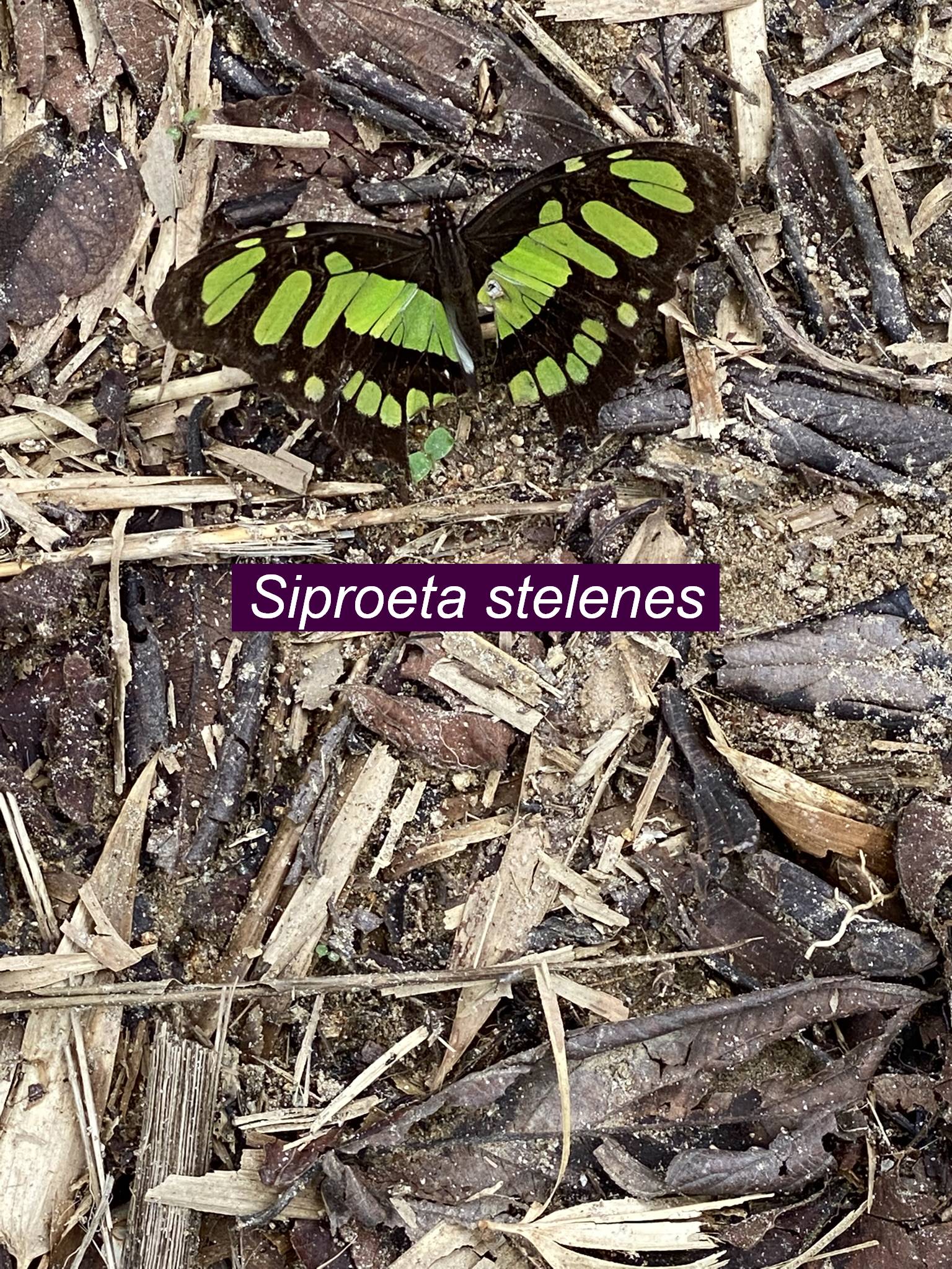 Esta especie se confunde con frecuencia con Philaethria dido, la llamada “scarce bamboo page”, debido a su coloración verde sobre oscuro. Sin embargo, Philaethria presenta una forma más alargada y delicada, con patrones más fragmentados y ligeros, mientras que Siproeta stelenes muestra una estructura más sólida y manchas verdes más amplias y continuas. Aquí, observada tanto sobre el suelo del bosque como a corta distancia, refleja un equilibrio entre camuflaje y presencia: su coloración se integra con la hojarasca y la luz filtrada, pero conserva la intensidad necesaria para la identificación y la comunicación dentro de su entorno.